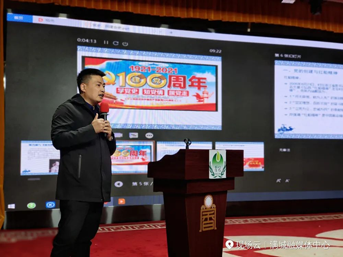 上圖為 保定市廣播電視報社黨支部書記劉賀田老師講《為什么選擇了共產黨》